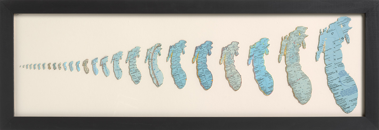 I cut out twenty-five Lake Michigans from maps of varying scales. I had in mind a fetal development chart, although many people seem to see a penis.