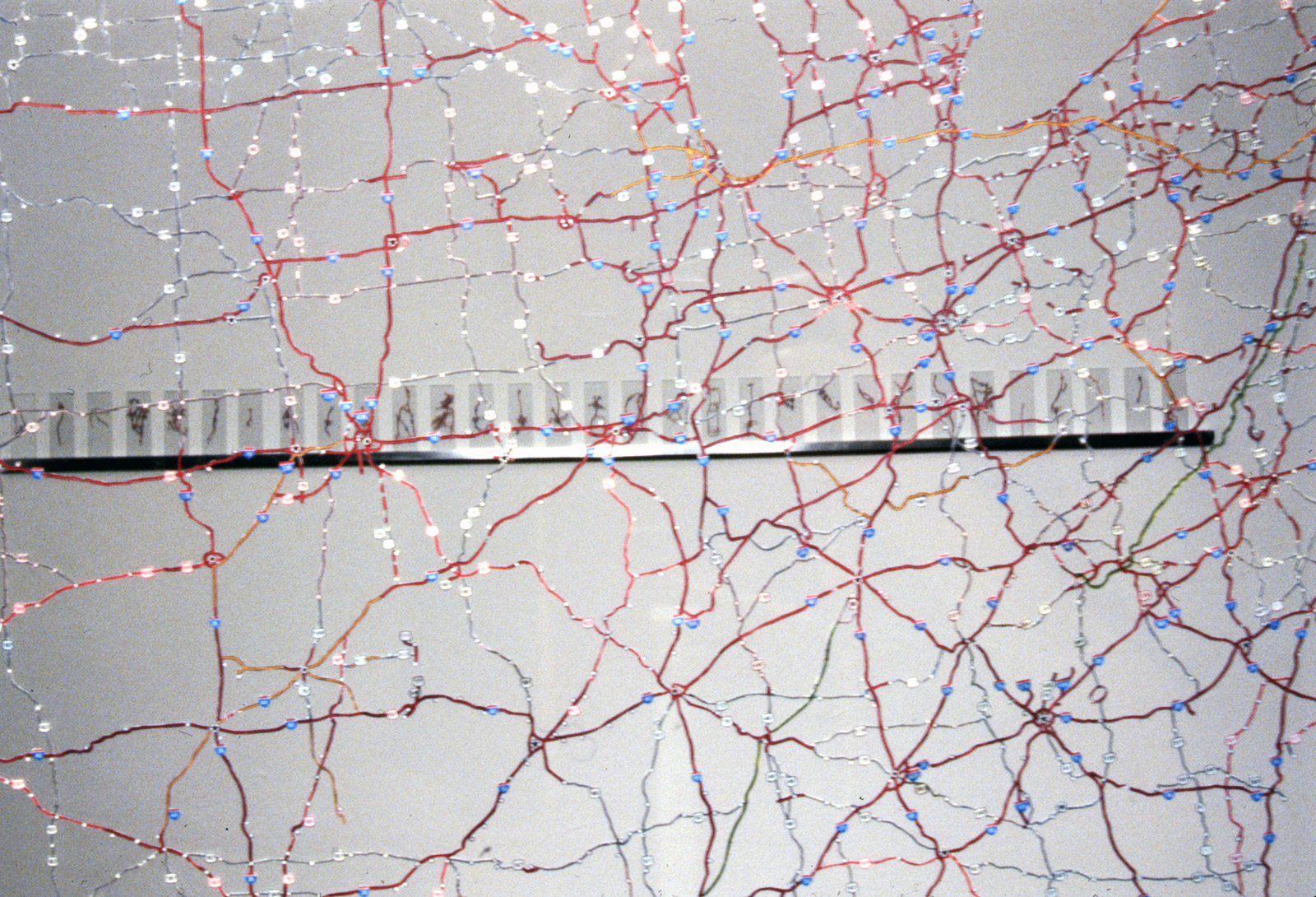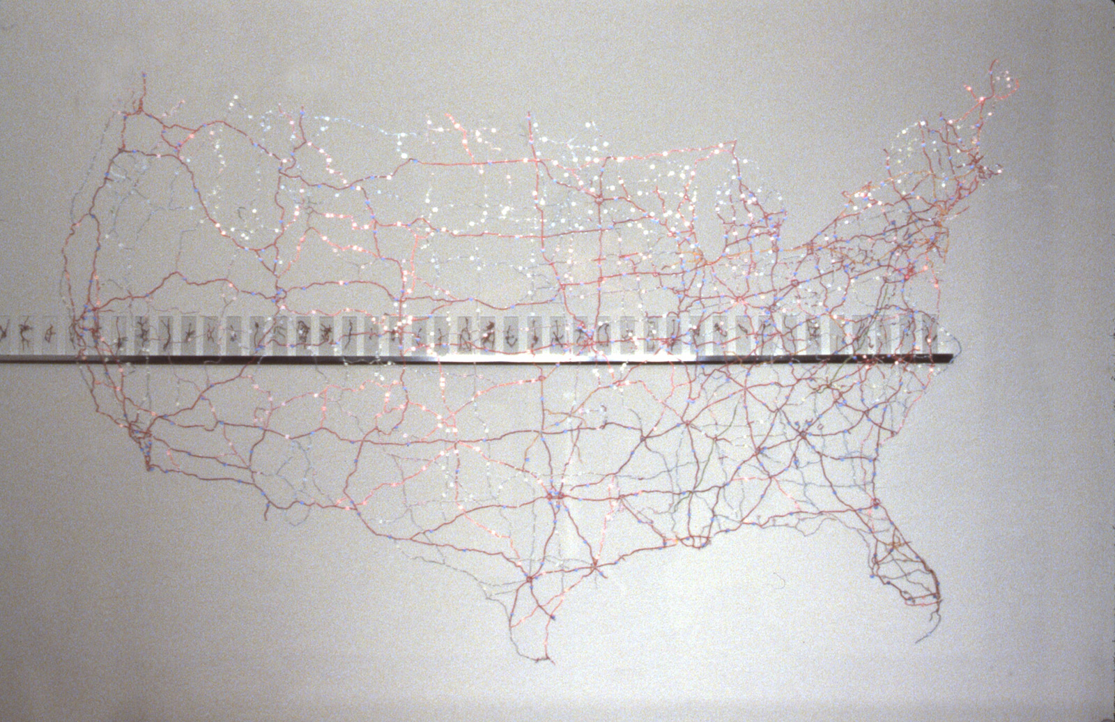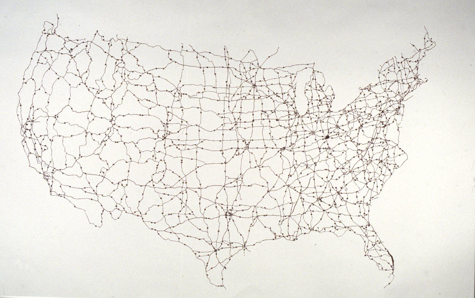 I dissected a AAA road map of the USA, removing all the land and leaving only the connected road network. The map was sandwiched between two large pieces of glass and suspended at eye height.