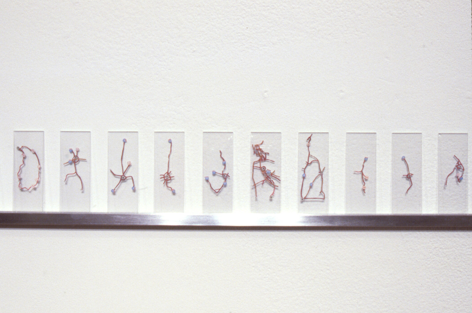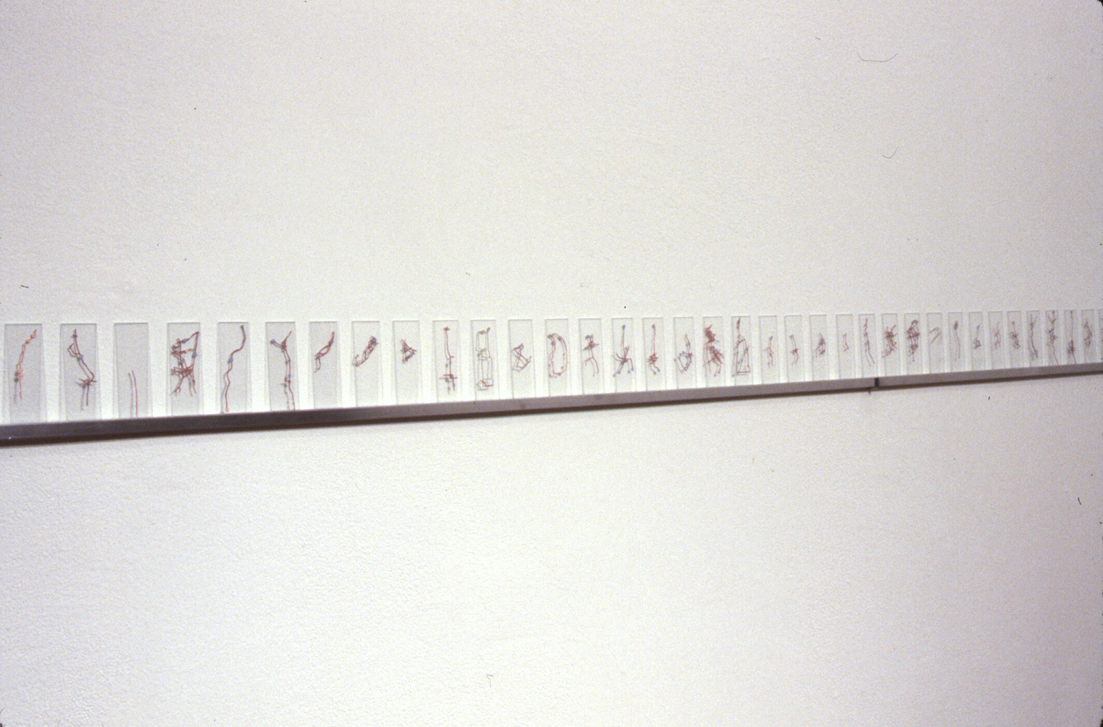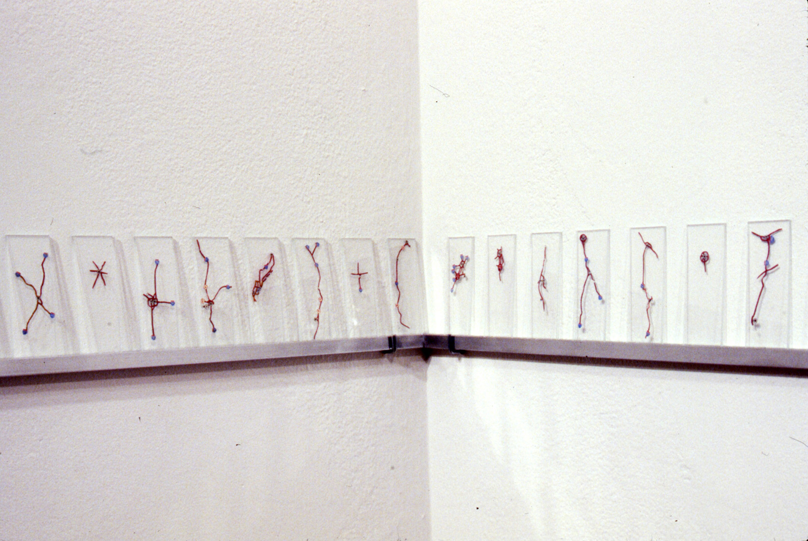 Map Dissection II, 1991. Cut paper map fragments placed between 200 microscope slides (each slide 2 x 0.75 inches) and arranged on 18-foot aluminum shelf.