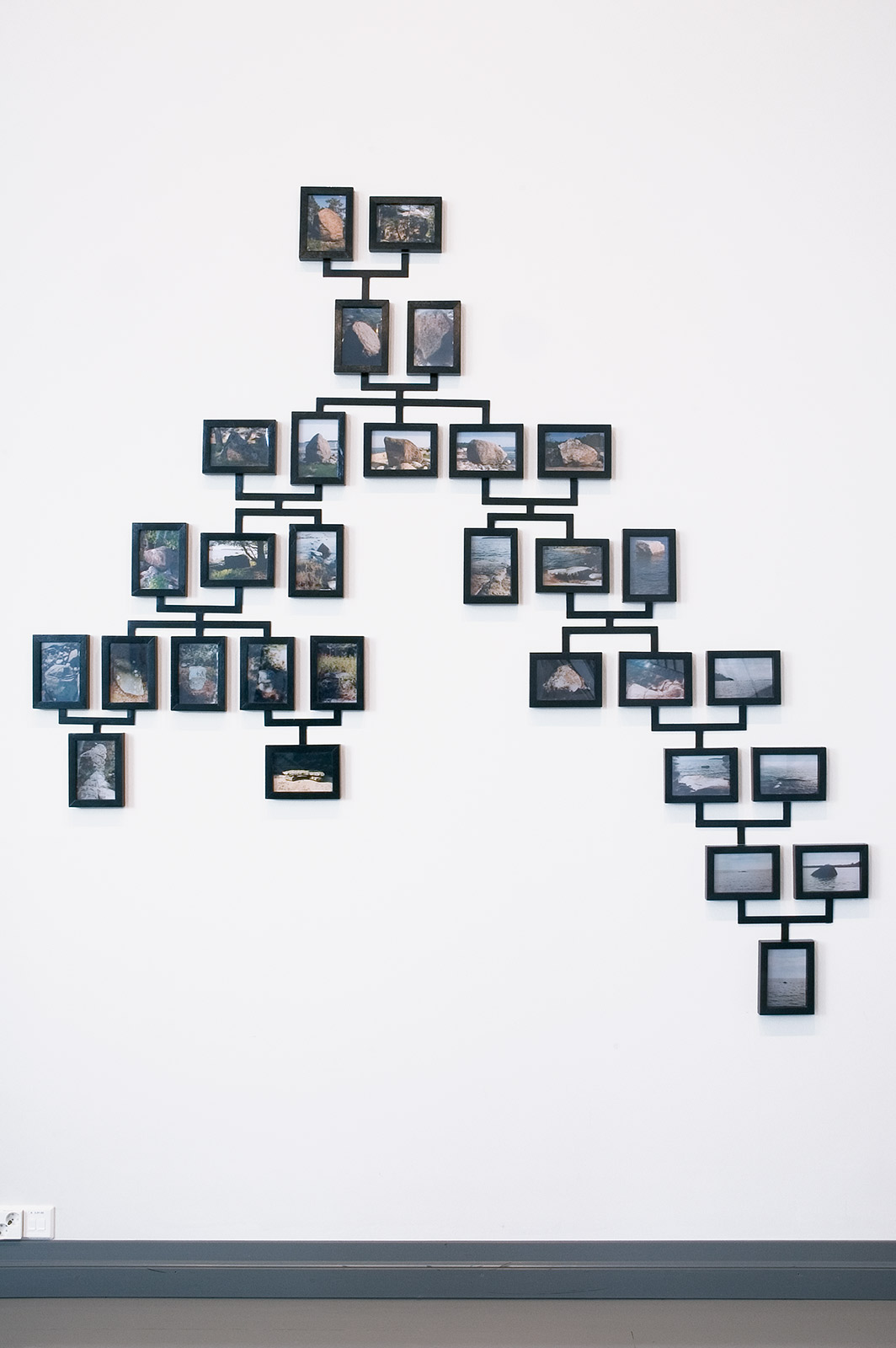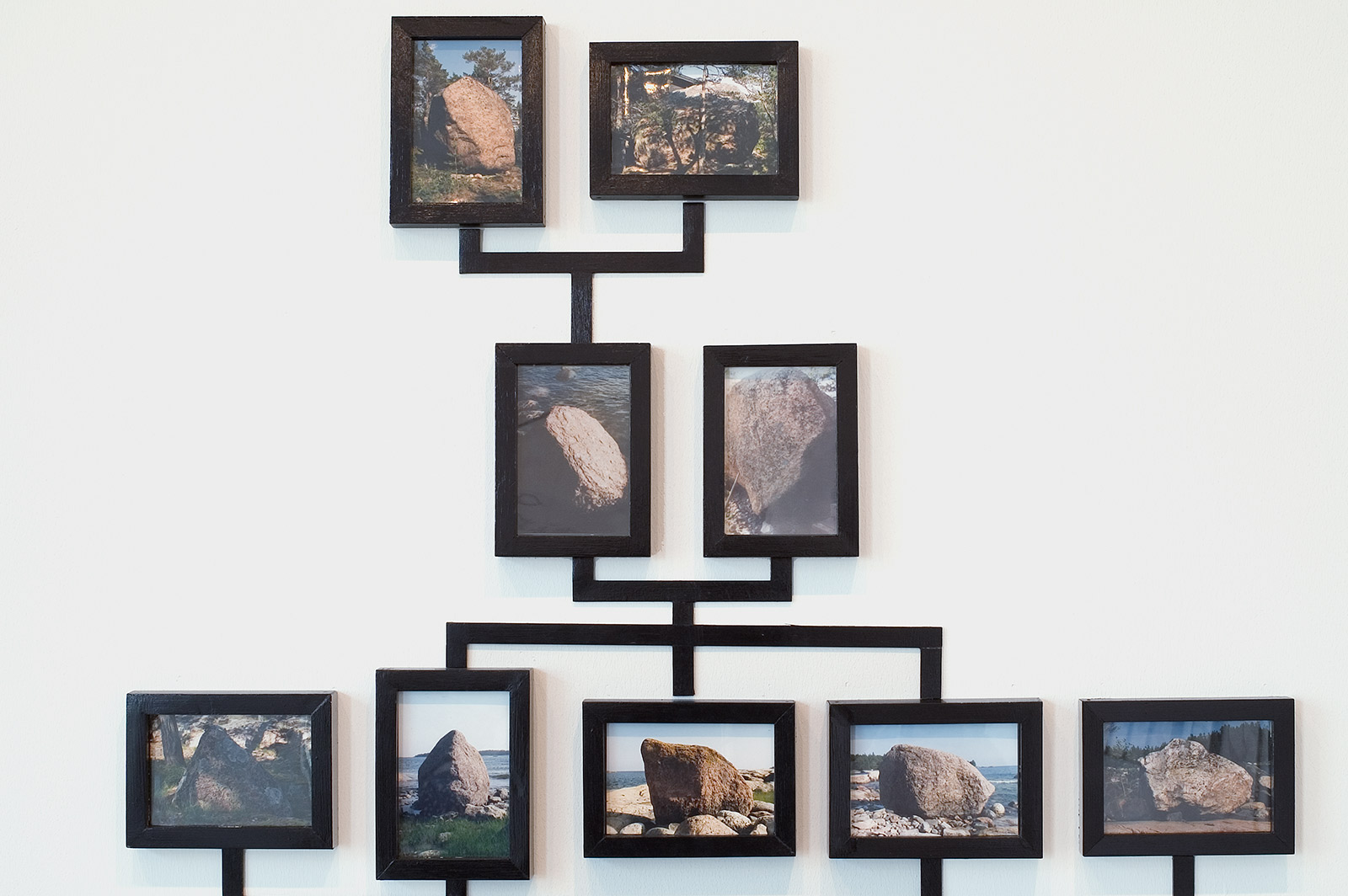 I took portrait-style photographs of various rocks on my family's summer property in Finland, then arranged these rocks into a family tree structure. On one side, the rocks become increasingly proximate to human presence and eventually turn into things like benches; on the other, the rocks grow ever more distant and evolve into “loner rocks” who leave land behind and head out to sea.