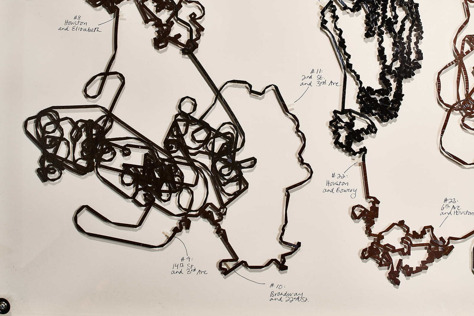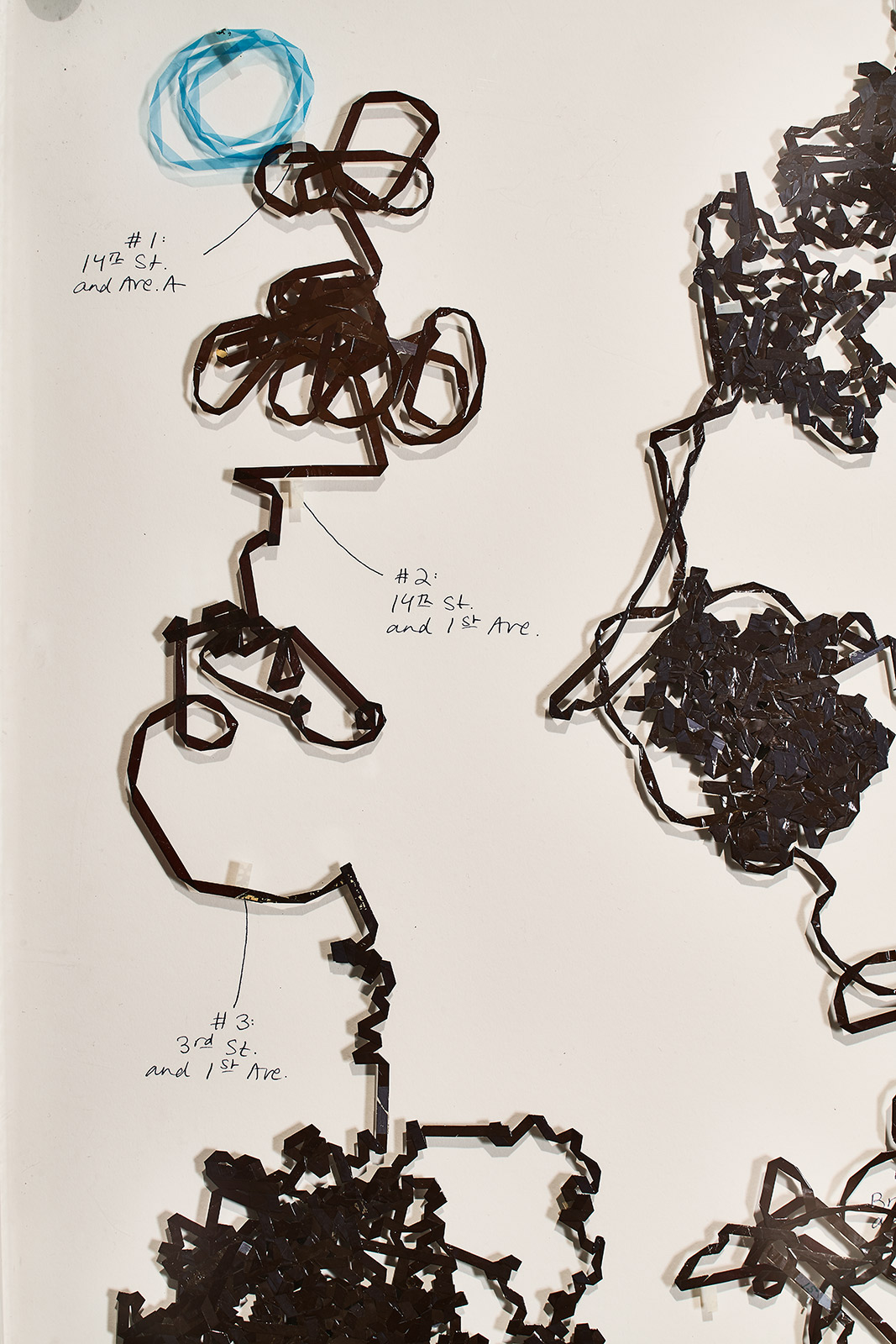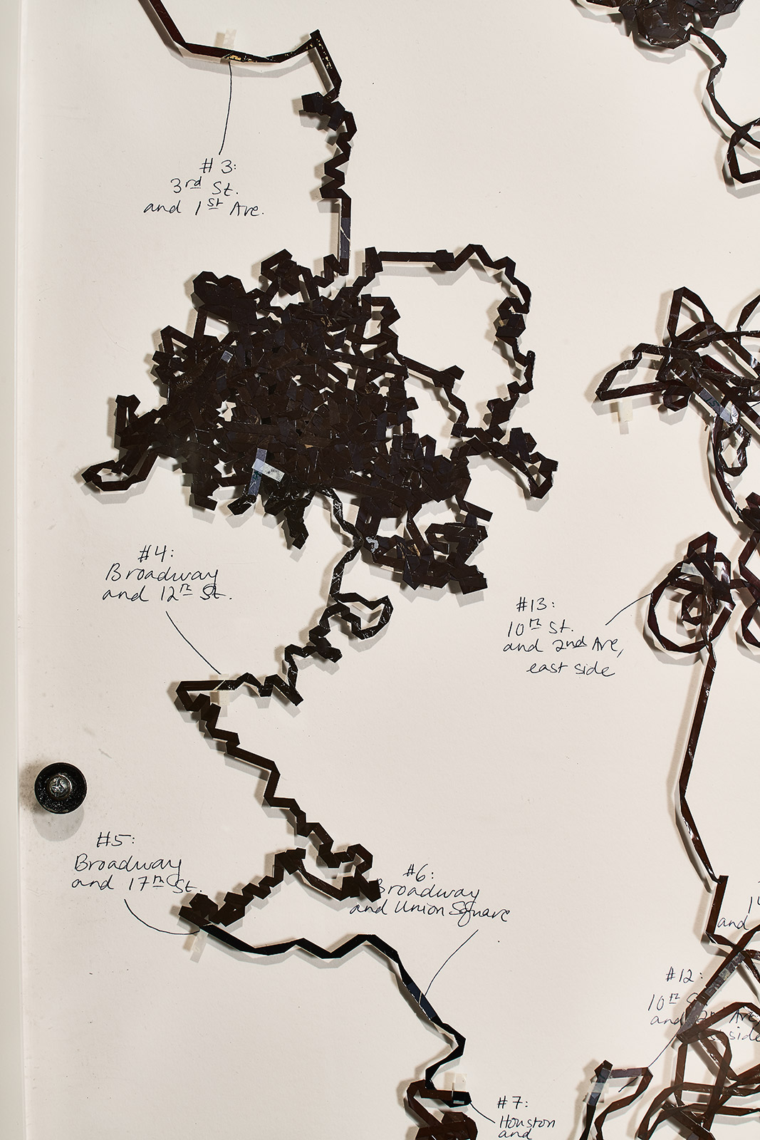 When exhibited, viewers can browse the sounds from the tape fragments using a digital media player. Each track number corresponds to a different tangle of found tape, as marked.