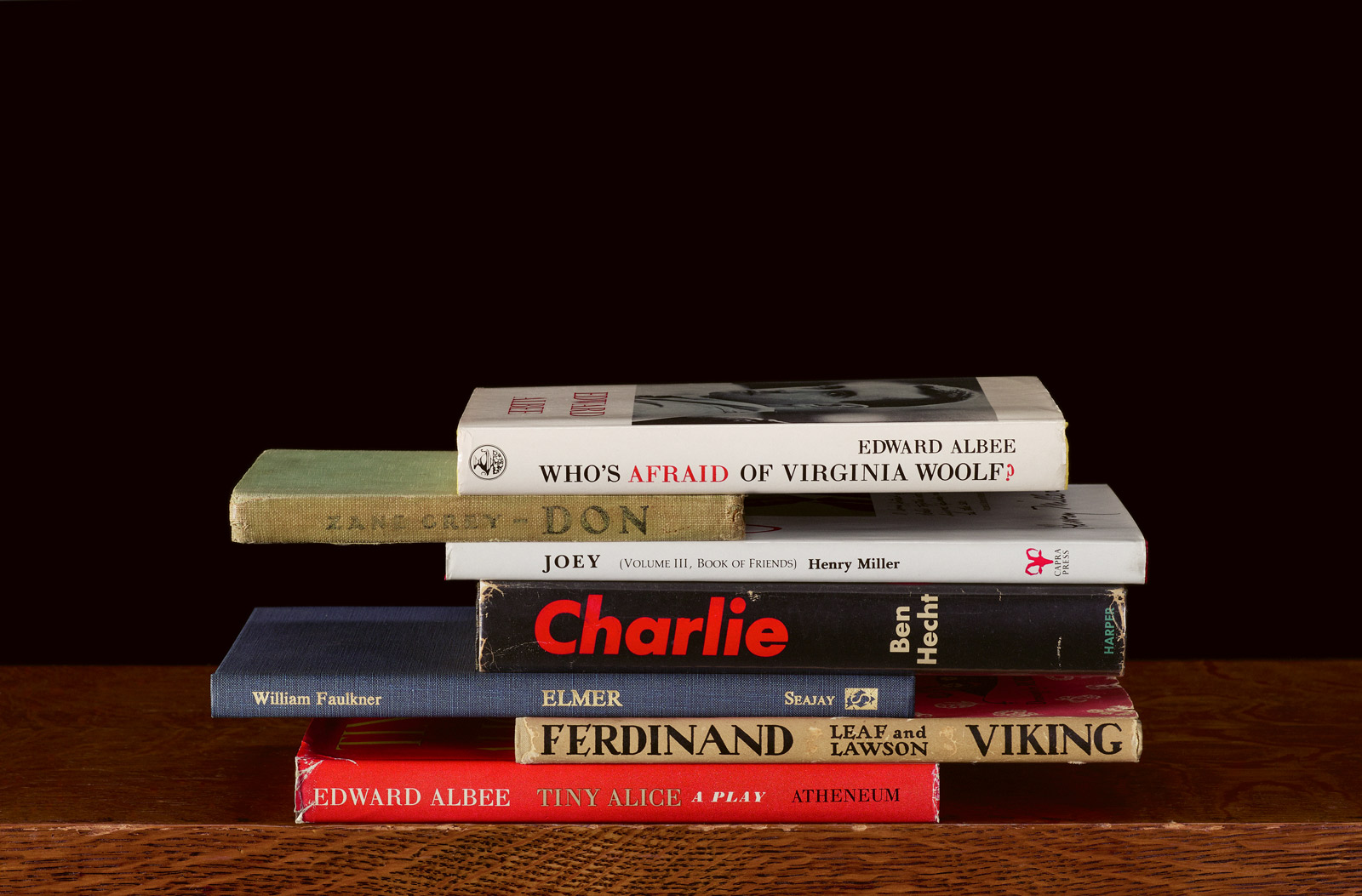 In each installment of my “Sorted Books” project (1993 and ongoing), I scour an individual’s or institution’s bookshelves in search of titles that, when arranged in sequence, form short phrases, stories, poems, or commentary. The resulting photographs serve as a portrait of the collector. My subjects have included the artist Isamu Noguchi, the writers William S. Burroughs and August Strindberg, a collection of books on magic at Brown University, and several of my friends.